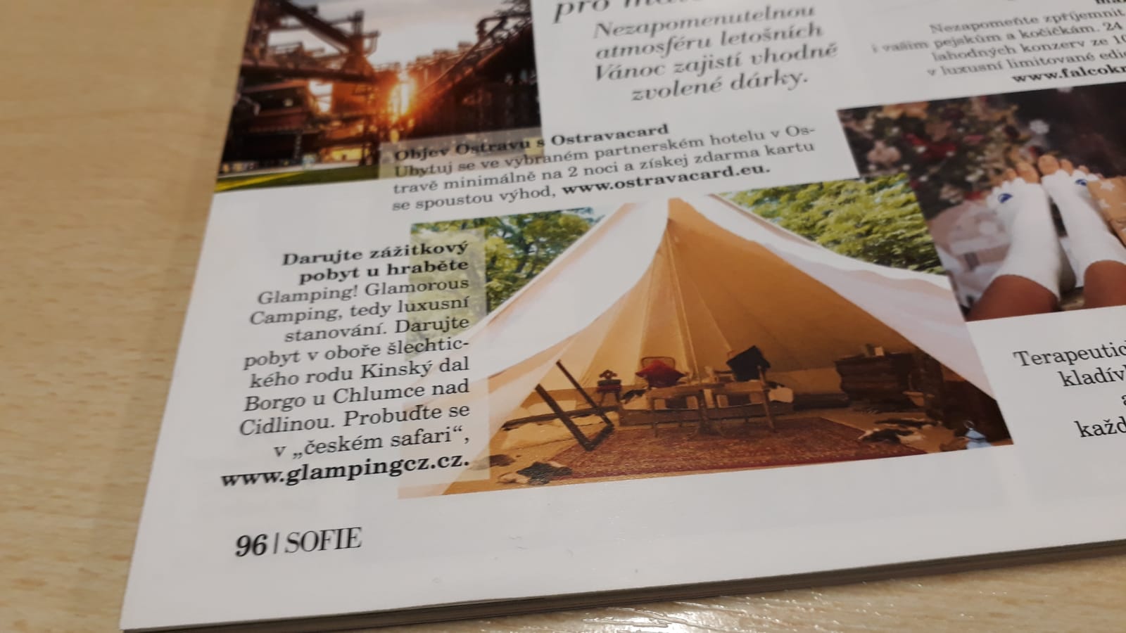 No internet je jedna věc, ale objevili jsme se už i v tištěných médiích. Stylový magazín Sofie v posledním čísle otisknul krátkou zmínku o našich vánočních dárkových poukazech na glamping. Takže pokud Vám ještě chybí dárek pod stromeček a chtěli byste být letos trochu originální, neváhejte nás kontaktovat zde!