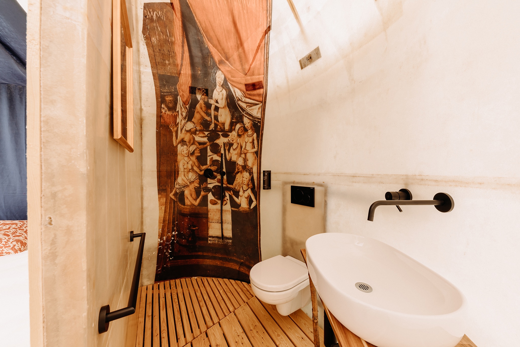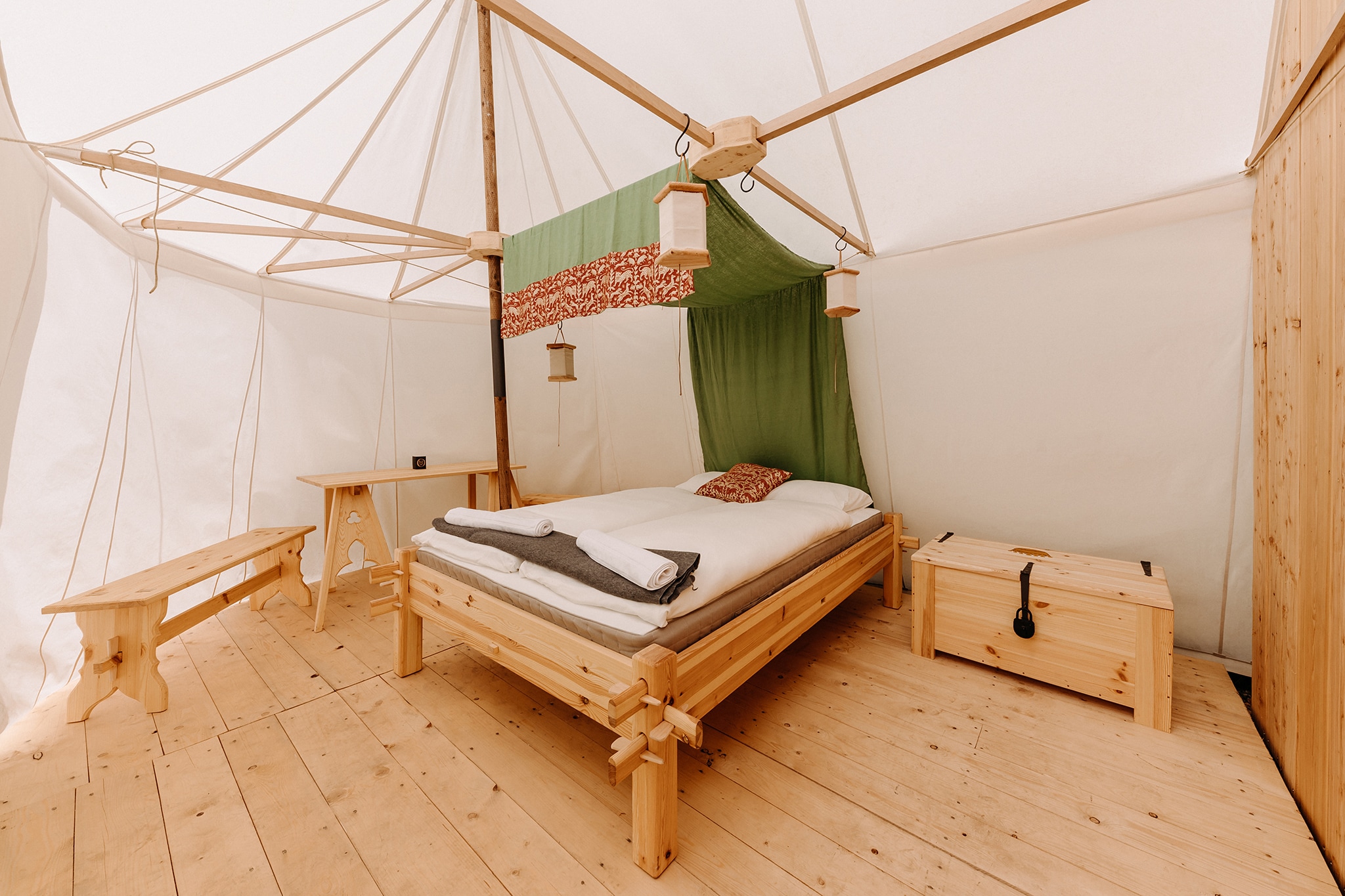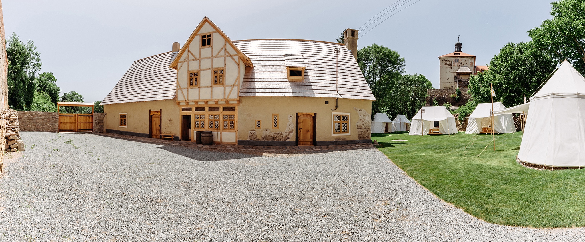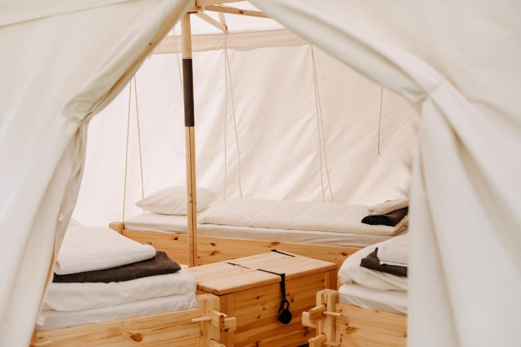 Chcete poznat, jak se žilo v podhradí pod středověkou tvrzí? Osm glampingových stanů, kde se čas před 500 lety zastavil najdete vyvážené propojení středověkého konceptu a moderních prvků. Každý stan nabízí maximální pohodlí, svoji vlastní koupelnu a toaletu. V ložnici se vyspíte se na pohodlných postelích, šaty i cennosti uložíte do dřevenné truhly, decentní osvětlení lucernami vytváří intimní a romantickou atmosféru.