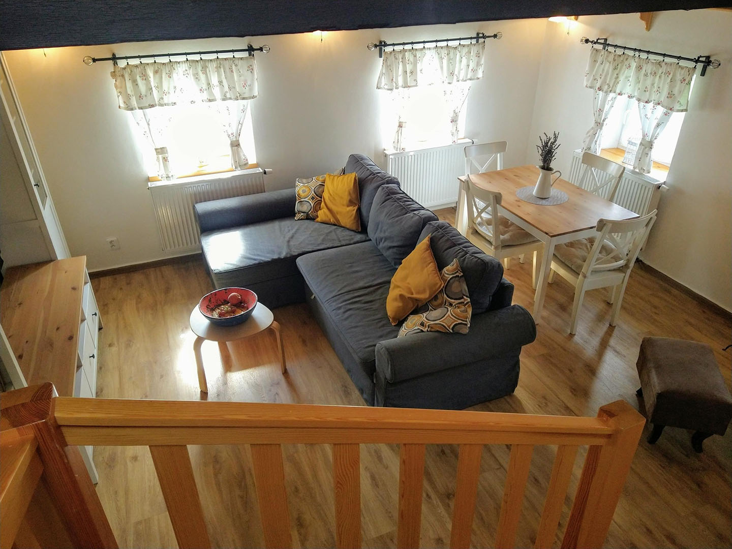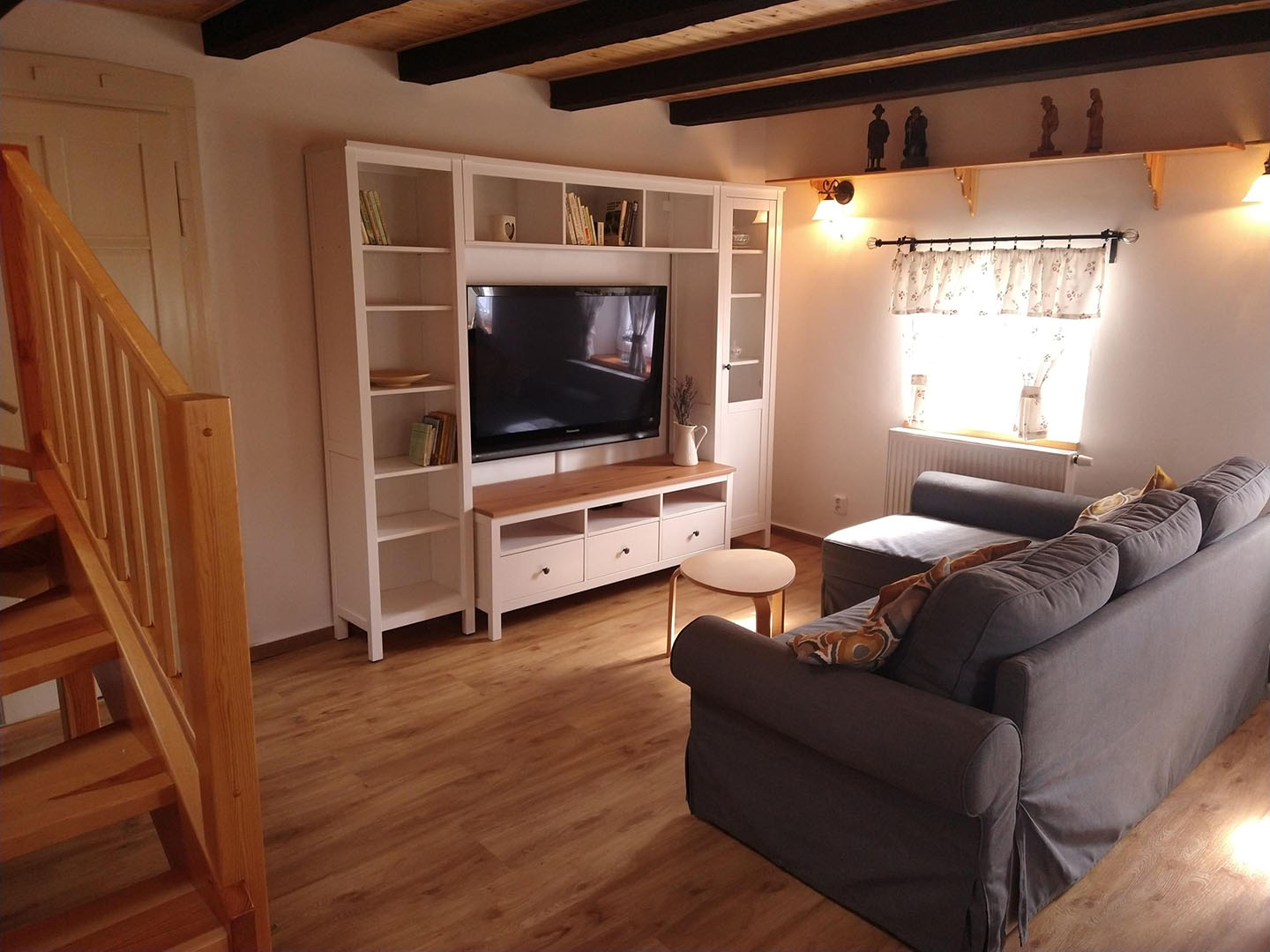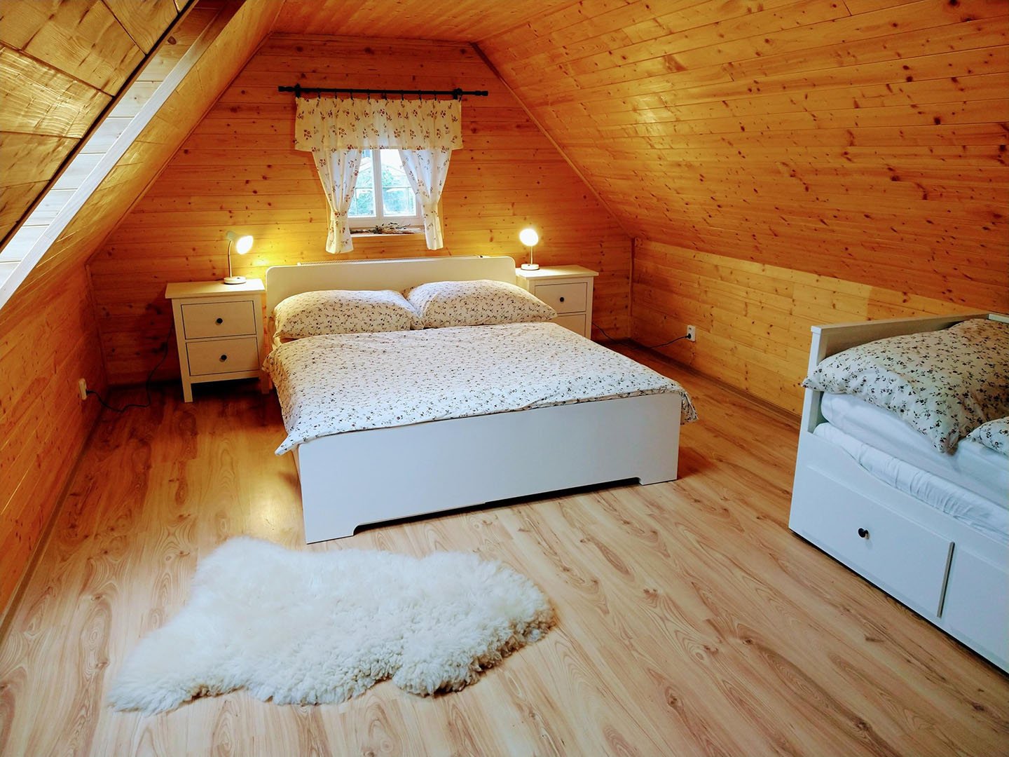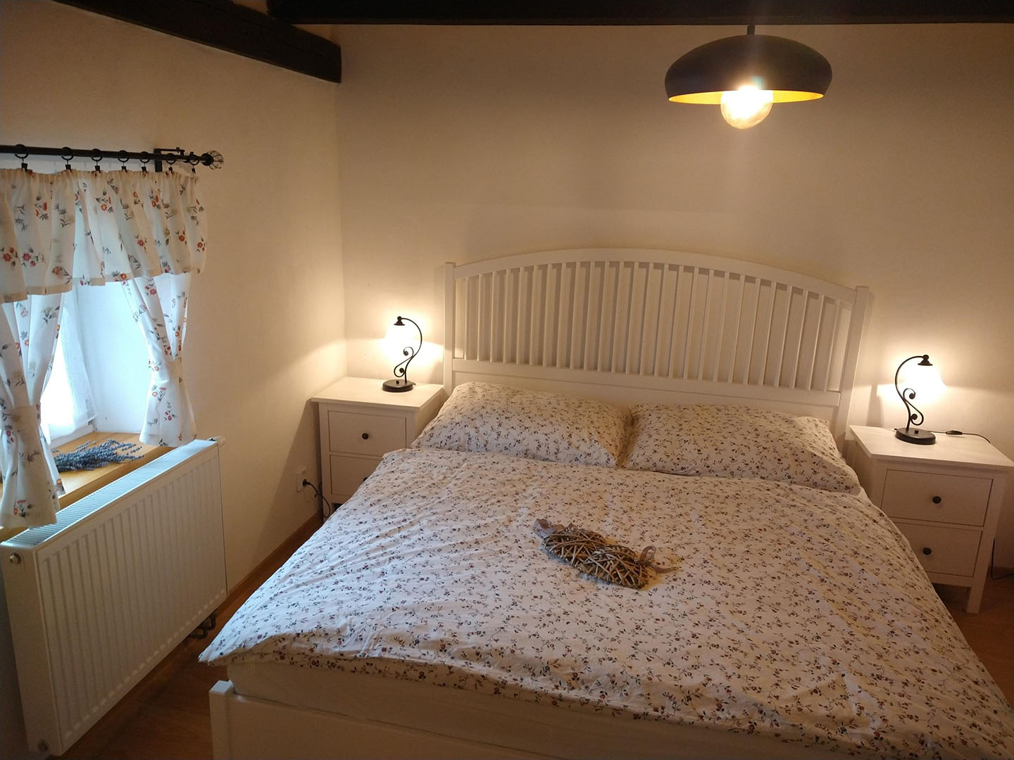Čekají na vás dvě patra vkusně zrekonstruované a stylově zařízené chaloupky. V přízemí na vás čeká menší ložnice, světnice s kuchyní a potravinovým sklípkem a také koupelna s toaletou, sprchovým koutem a dvěma umyvadly. V kuchyňce najdete veškeré vybavení ke každodennímu vaření a stolování včetně varné sklokeramické desky, horkovzdušné trouby, lednice s mrazákem, varné konvice a myčky nádobí. V patře jsou dva neprůchozí pokoje. Chloubou roubenky je stylové venkovní posezení s masivním stolem a lavicemi až pro 12 osob. Pod pergolou je k dispozici i malá venkovní lednička, nástěnné elektrické topení pro chladnější večery. Ohniště s novými lavicemi je jen pár krůčků od roubenky, dřevo na opékání už je připraveno! K dispozici je pro vás i venkovní gril.